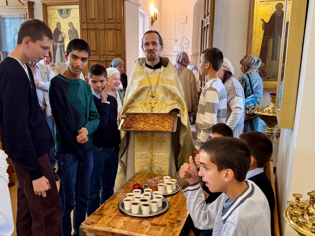 19 августа 2025 года, в праздник Преображения Господа Бога и Спаса нашего Иисуса Христа,за Божественной литургией в Крестовоздвиженском храме г. Коломна вместе с прихожанами молились дети-инвалиды, проживающие в детском доме-интернате «Добрый дом «Коломенский». По традиции по окончании Богослужения настоятель иерей Иоанн Бакушкин совершили освящение плодов. Освященные яблоки и виноград были розданы прихожанам и гостям храма. После чего состоялось чаепитие, а детям-сиротам также вручили сладкие подарки.
