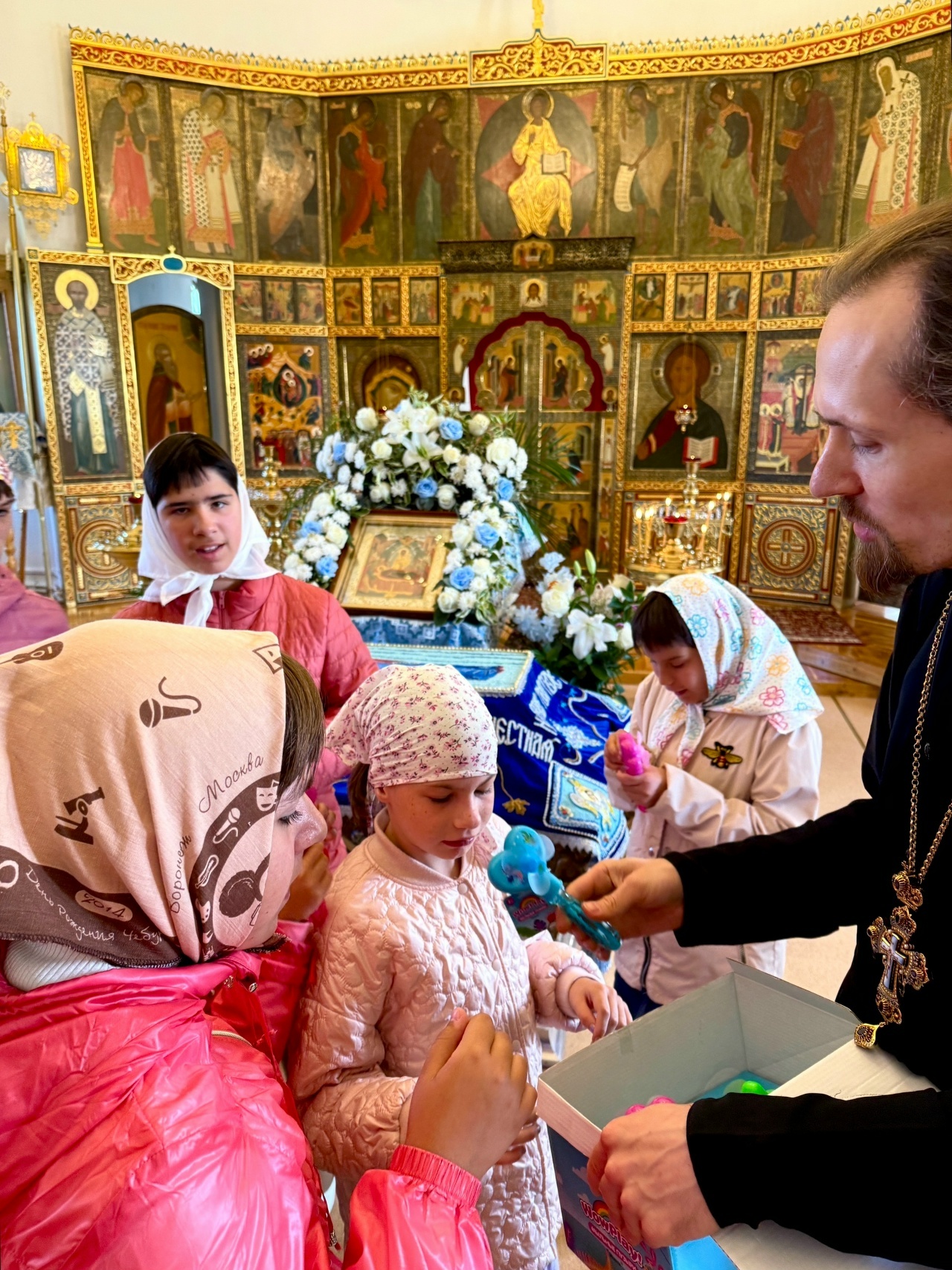 28 августа 2025 года, в праздник Успения Пресвятой Богородицы, за Божественной литургией в Крестовоздвиженском храме города Коломны вместе с прихожанами молились дети-инвалиды, проживающие в детском доме-интернате «Добрый дом «Коломенский». По окончании Богослужения состоялось чаепитие, и настоятель иерей Иоанн Бакушкин вручил гостям подарки.